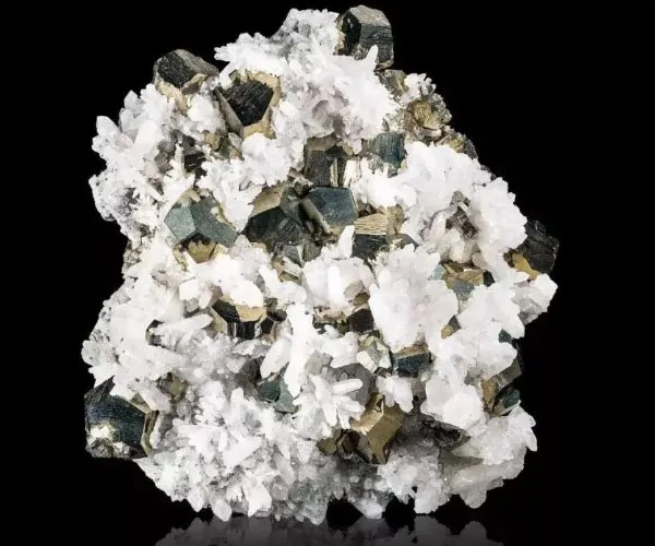 黃鐵礦結(jié)晶體又稱為愚人金,主要成分為二硫化亞鐵,外觀造型也是跟地址環(huán)境有關(guān),最常見的就是正方體狀,是熱液礦脈中出現(xiàn)的完美晶體,黃鐵礦結(jié)晶體還會出現(xiàn)八面體、五角十二面體等。黃鐵礦結(jié)晶體看起來相當(dāng)漂亮,有一定的觀賞價值。黃鐵礦伴隨水晶晶看起來更加漂亮:黃色晶體在白色半透明的石英襯托下更顯得璀璨奪目。聽聽愚人金這名字就知道,好多人把這種礦石誤認(rèn)成黃金。